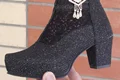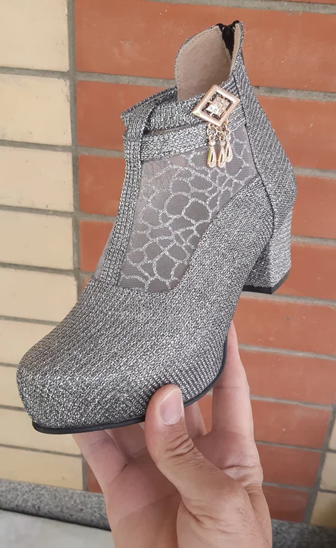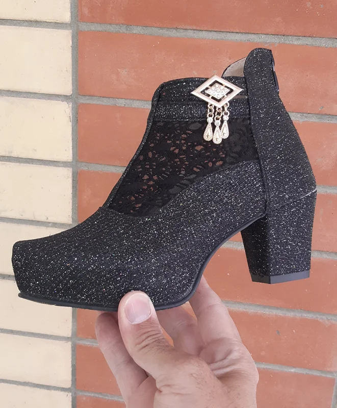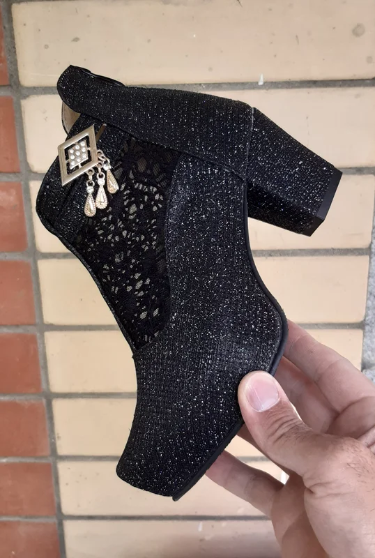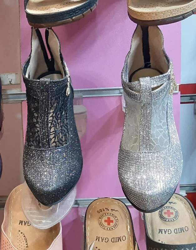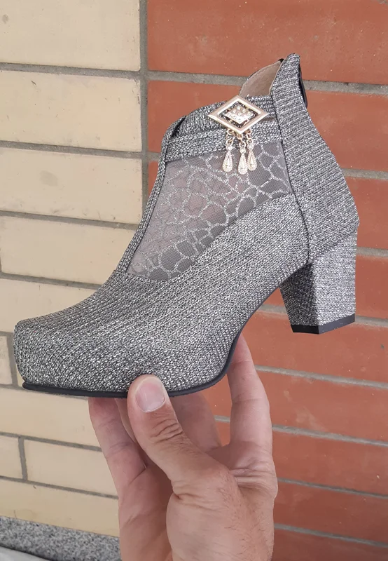 مشخصات فنی. نیم بوت مجلسی زنانه ، جنس رویه چرم صنعتی شنل دوزی جنس زیره پلی اورتان (پی یو)(PU)رنگ مشکی و نقره ای مدل ، پاشنه بلند ۵ سانتی متری زیپ دار که زیپ آن از پشت کفش میباشد. سایزهای موجود از رنگ مشکی فقط سایز ۳۶. و از رنگ نقره ای فقط ۳۷ و ۳۸ موجود است.
